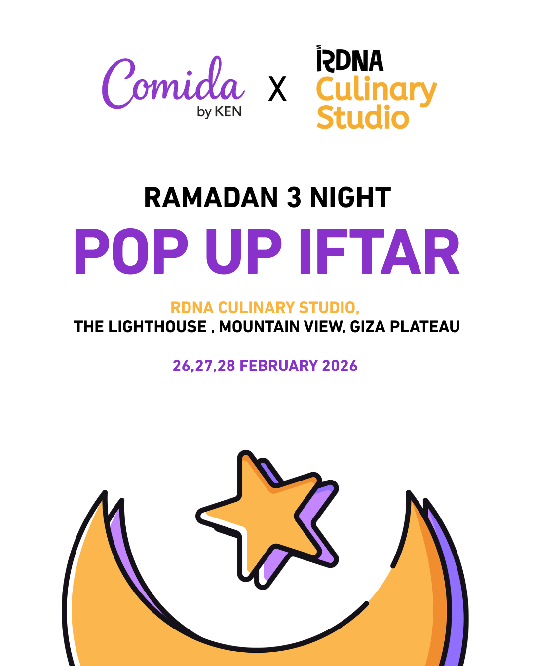 For February 26, 27 & 28, Comida by KEN joins forces with RDNA Culinary Studio for an exclusive Iftar pop-up at The Lighthouse, Mountain View, Giza Plateau (Location Map).